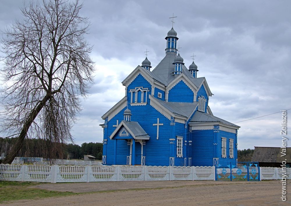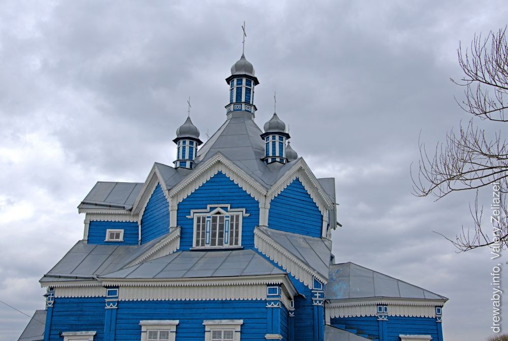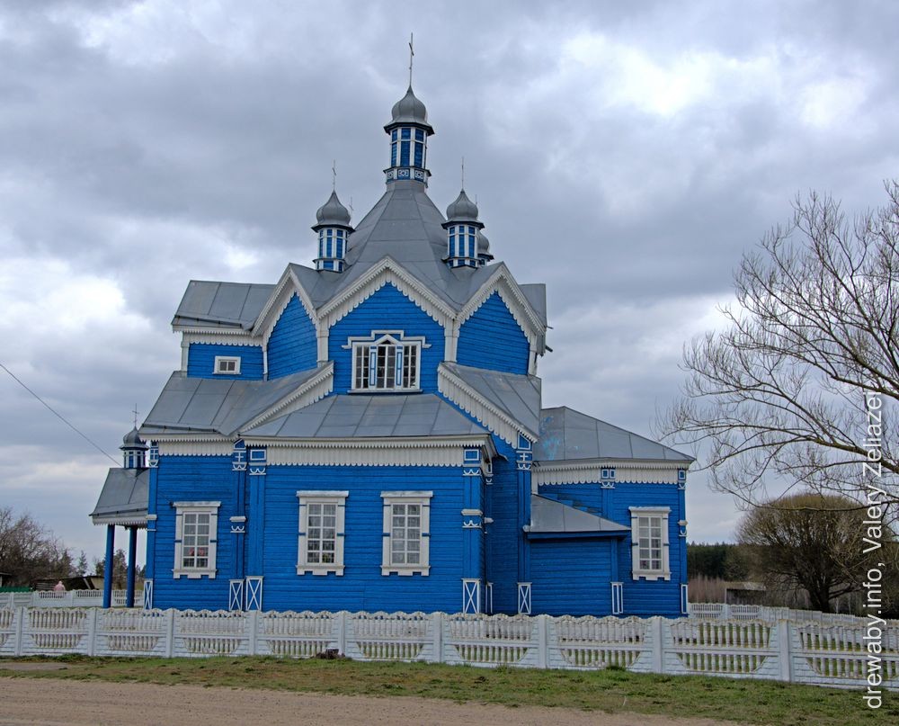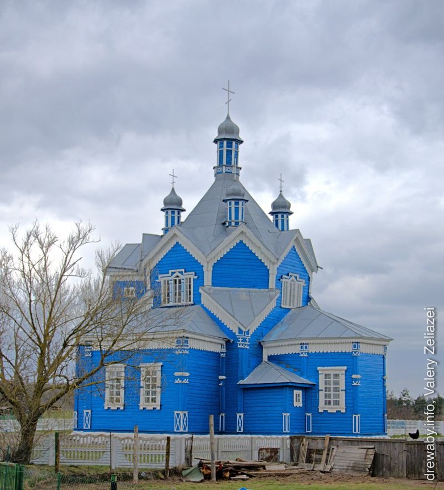 Царква стаіць у цэнтры вёскі, на адасобленай тэрыторыі. Храм у плане — выцягнуты прамавугольны зруб, да якога з усходняга тарца далучаецца пяцісценная апсіда з 2 рызніцамі. Да бакавых фасадаў прылягаюць 2 невялікія зрубы (бакавыя прыдзелы), якія ў плане ўтвараюць форму крыжа. У цэнтры галоўнага фасада над уваходам — брыль: 2 тонкія слупы падтрымліваюць двухсхільны дах, які ўтварае прамавугольны франтон. Над франтонам макаўка на масіўнай шыйцы. Канструкцыйнае вырашэнне храма складанае. Над асноўным аб'ёмам пануе высокі шацёр з цыбулістым па форме купалам на глухім васьмігранным барабане. Вакол шатра размешчаны 4 прамавугольныя аб'ёмы (адзін з іх на галоўным фасадзе), якія пакрыты двухсхільнымі дахамі. На іх вільчыку, бліжэй да шатра, стаяць 4 цыбулістыя галоўкі на высокіх васьмігранных барабанах. Такім чынам утвараецца пяцігаловая кампазіцыя, характэрная для старажытнарускага дойлідства.
