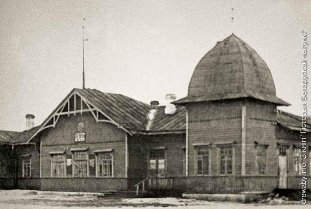 Будынак вакзала ў Лепелі на фота 1935 года. Пабудаваны ў 1926 годзе, да нашага часу не захаваўся.