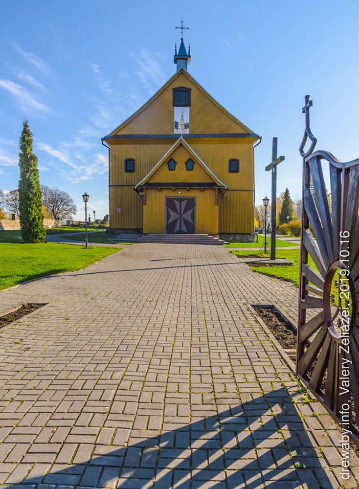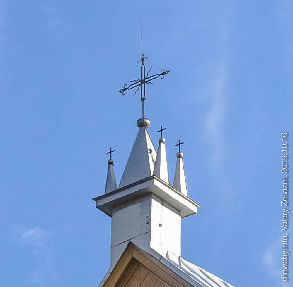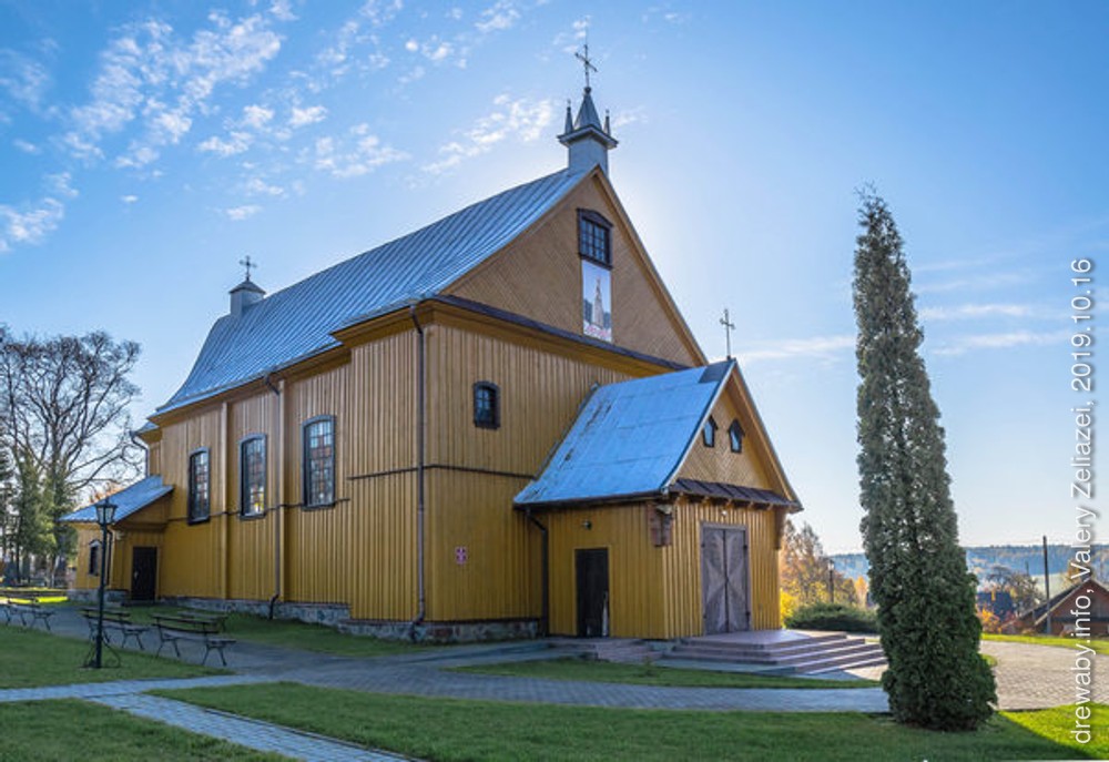 Помнік драўлянага дойлідства з элементамі стылю барока. Асноўны прамавугольны ў плане зруб накрыты 2-схільным гонтавым дахам, які набывае пластычную гранёную форму і выгіны над 5-гранным алтарным прырубам з нізкімі сакрысціямі. Галоўны фасад меў 2 купальныя чацверыковыя вежы (не захаваліся), што фланкіравалі 3-вугольны франтон з шатровай сігнатуркай. 1-схільны дах нізкага прытвора ў 1920-я гг. заменены 2-схільным з 3-вугольным франтонам. 3 мураванага дойлідства запазычана лучковая форма аконных праёмаў, што вылучаюцца на вертыкальнай шалёўцы сцен і разам з брусамі-сцяжкамі ствараюць іх рэгулярны архітэктурны рытм.