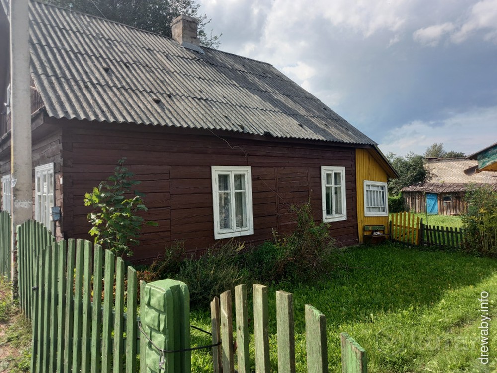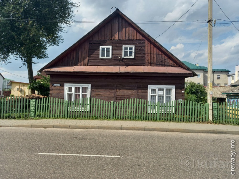 Кампазіцыя фасада пабудавана на рытме квадратных вокнаў першага паверха і франтона. У плане прадстаўляе квадрат. Дом выстаўлены на продаж: https://re.kufar.by/vi/ivie/kupit/dom/133710898