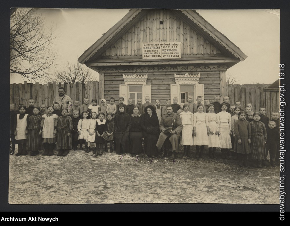 Група дзяцей бежанцаў з прыюту ў в. Грабаўка. 1918 год. Dzieci z ochrony, ambulatorium i pracownicy Odziału w Homlu- guberni Mohylewskiej.https://www.szukajwarchiwach.gov.pl/ru/jednostka/-/jednostka/12398332