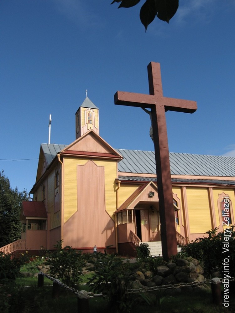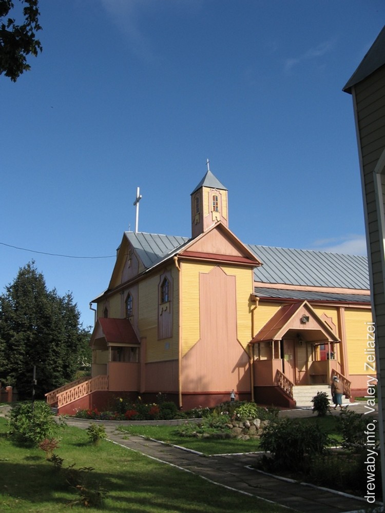 Помнік драўлянага дойлідства з рысамі барока. 3-нефавая 2-вежавая базіліка на высокім мураваным цокалі. Мае ярусную аб'ёмна-прасторавую кампазіцыю: да цэнтральнага высокага нефа, які пераходзіць у 5-гранную апсіду, далучаюцца больш нізкія бакавыя нефы з 1-схільнымі пакрыццямі. Галоўны фасад вырашаны шырокай вертыкальна ашаляванай плоскасцю. Першапачаткова фасад быў фланкіраваны дзвюма 2-яруснымі чацверыковымі вежамі, завершанымі пластычнымі па форме каркаснымі шатровымі сігнатуркамі (вежы былі знесены і ў наш ужо час надбудаваны нізкія вежачкі). Паміж імі быў размешчаны фігурны валютны шчыт, што прыкрываў 2-схільны дах — кампазіцыя, запазычаная з барочнай мураванай архітэктуры. Па цэнтры фасада было лучковае акно, што асвятляла хоры, і 4-слуповы ганак. Бакавыя фасады расчлянёны 2 радамі прамавугольных (раней лучковых) аконных праёмаў і вертыкальнымі брусамі-сцяжкамі ў прасценках.