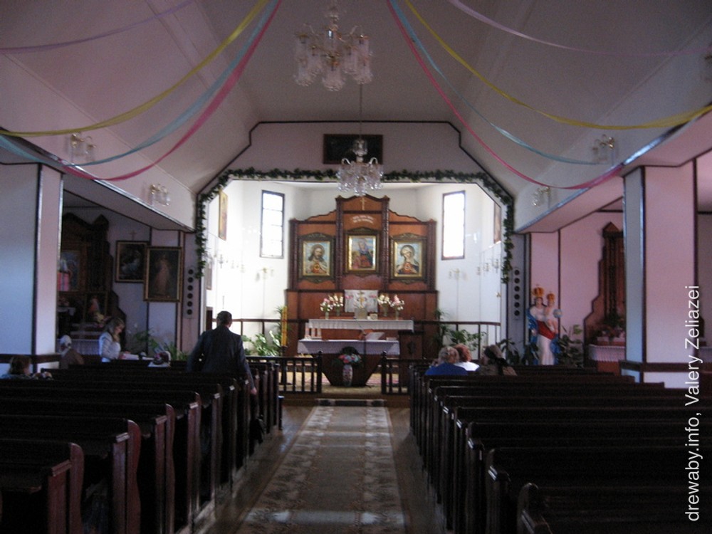 Мастацкім акцэнтам інтэр'ера з'яўляўся драўляны барочны алтар (не захаваўся), выкананы ў форме порціка з 2 парамі размешчаных уступам канеліраваных карынфскіх калон, якія неслі лучковы франтон з разной кампазіцыяй "Глорыя". Характарызаваўся напружанасцю і экспрэсіўнасцю архітэктурна-пластычнай кампазіцыі, выгінамі хвалістага франтона і карнізных паясоў, насычанасцю скульптурай, вазамі і дэкаратыўнай разьбой. Уся архітэктурна-пластычная кампазіцыя была ўзнята на высокі філёнгавы цокаль са скульптурамі апосталаў па баках. У цэнтры алтара быў жывапісны абраз "Прасвятая Багародзіца" 18 ст.